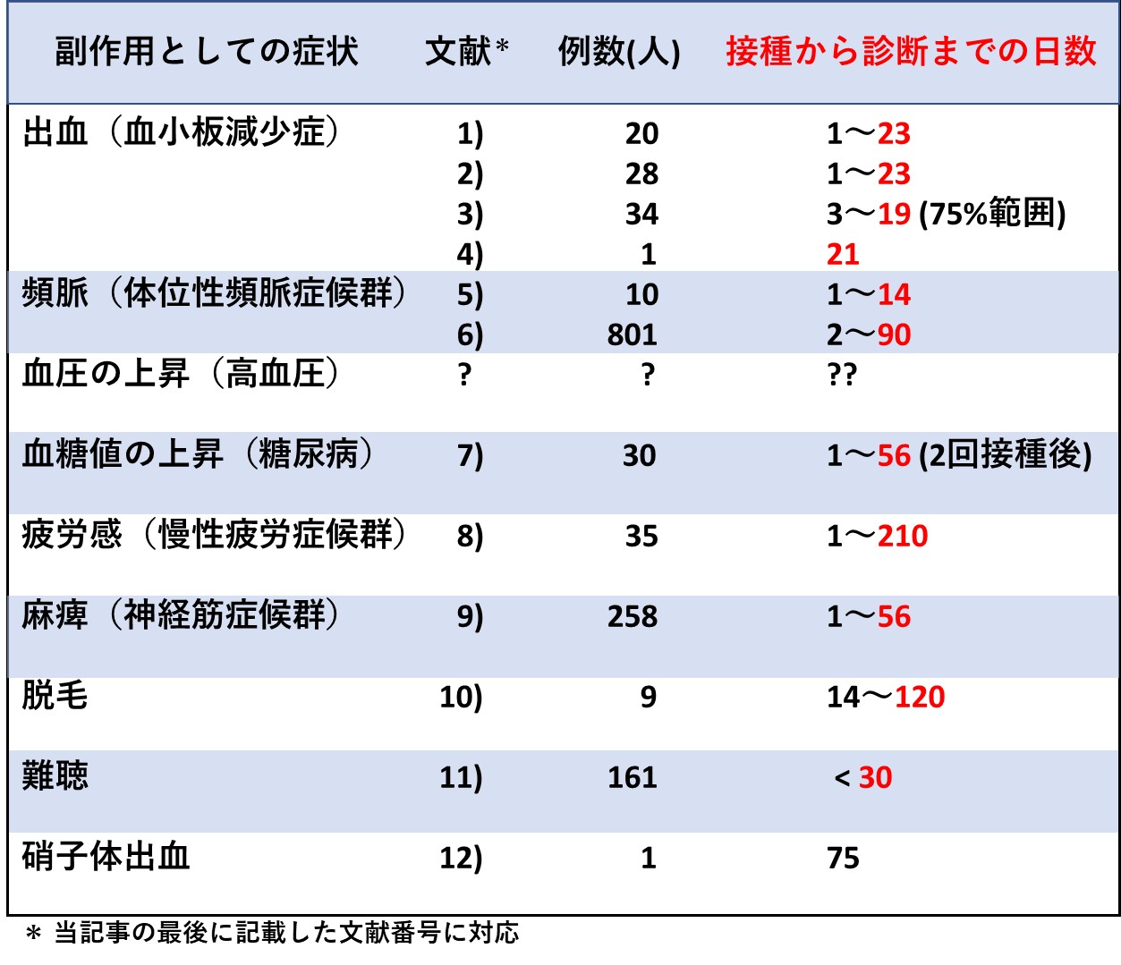 同表からわかるように、症状によっては接種後、100日以上も経ってから診断された事例も報告されています。なお、「血圧が上がったままさがらない」と悩んでいる人もいますが、接種後の血圧変動を長期にわたって調べたというデータがいまのところ見つかっていません。